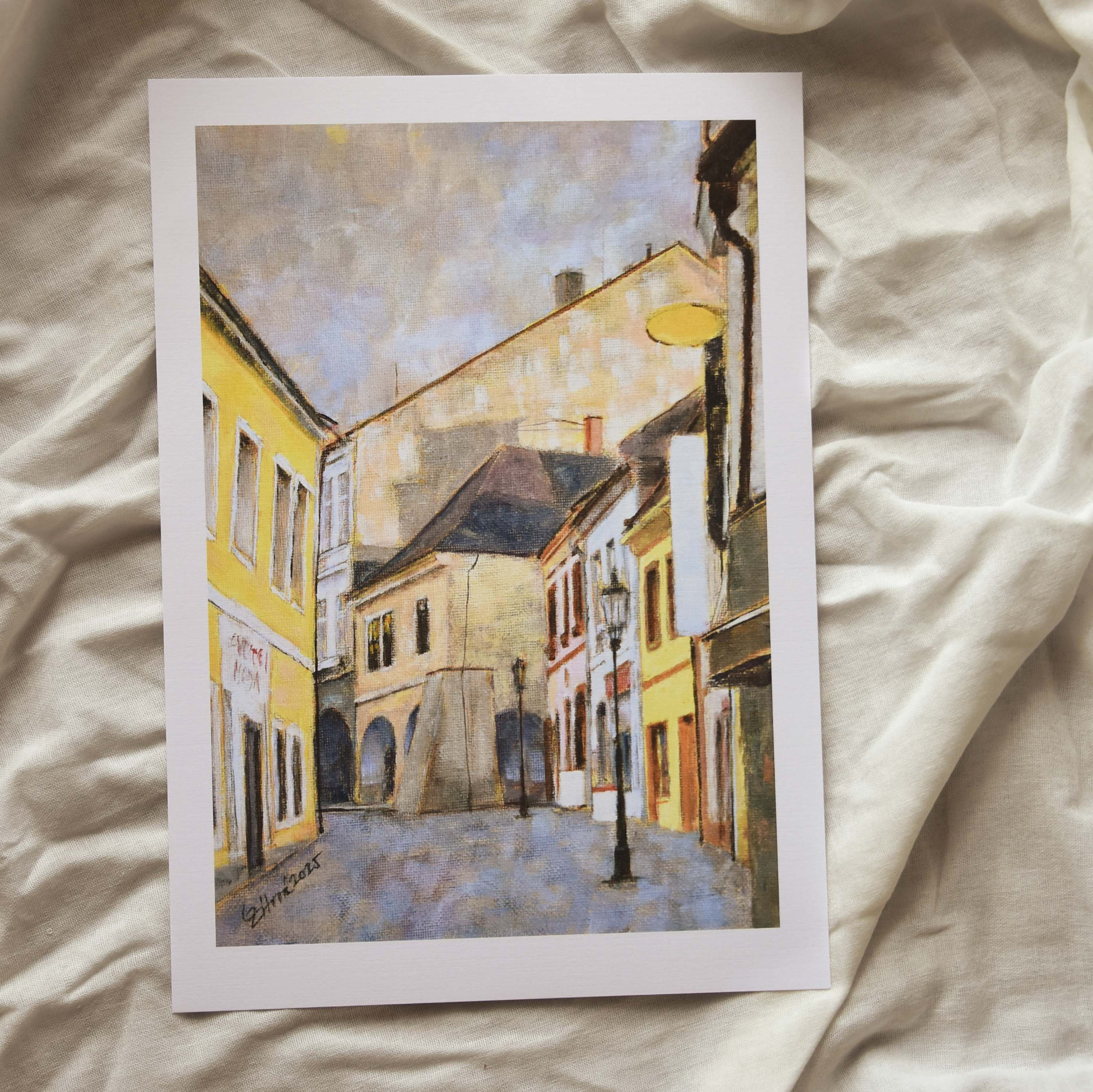 Tisk autorského obrázku Chrudimi (Havlíčkovy ulice) na matný karton gramáže 270 g/m2 s plátěnou ražbou.